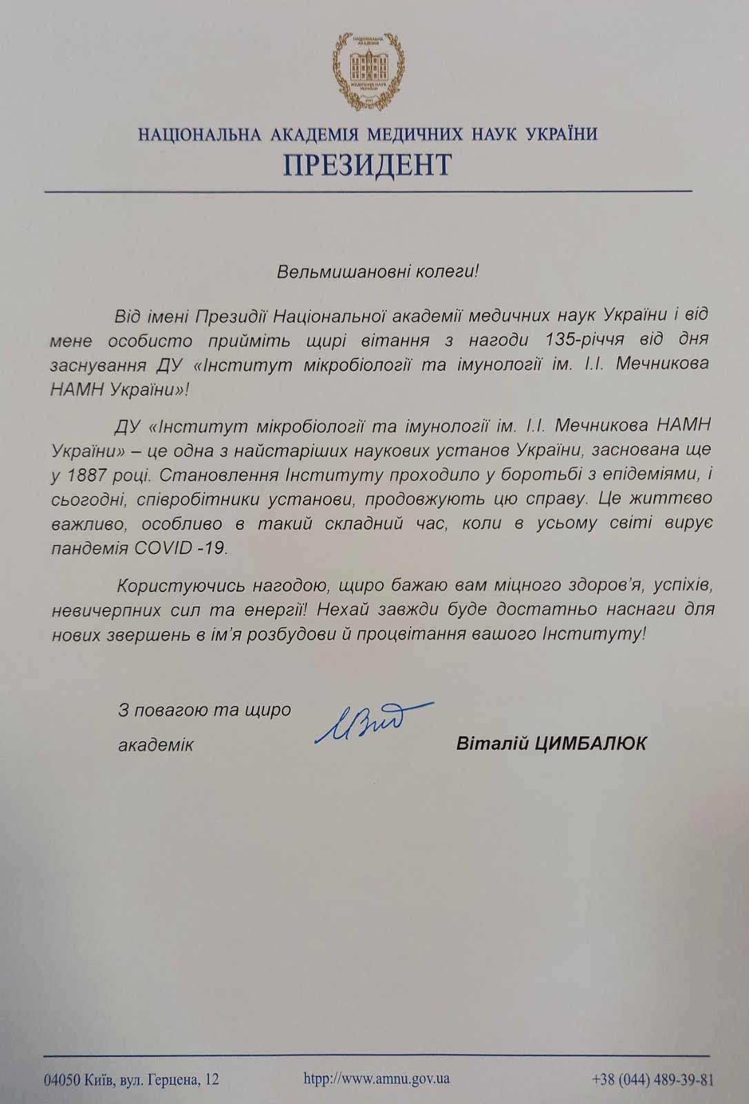 Привітання від Президента НАМНУ академіка Цимбалюка з нагоди 135-річчя нашого інституту [Посилання]